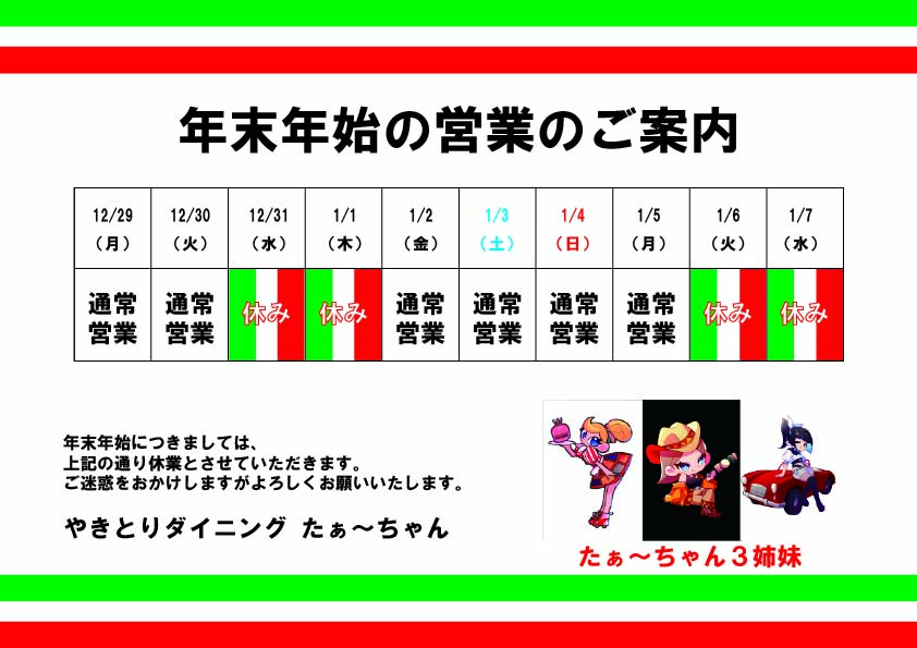 今後ともやきとりダイニングたぁ~ちゃんをよろしくお願い致します。